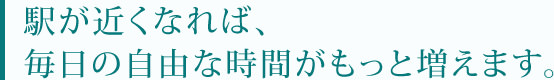 駅を中心とした周辺エリアには、ショッピングをはじめ、金融、行政機関などの生活利便施設が集中しています。住まいが駅から近ければ、それらの施設をいつでも気軽に使うことができ、複数の用事も一度に済ませることができるはず。また、バスや自転車では大変な、毎日の保育園への送り迎えもずっと楽になります。