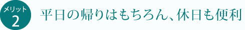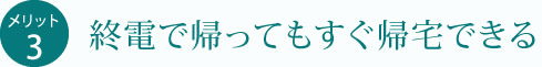 女性やお子さまにとって、毎日暗い夜道を歩くのは不安です。人の往来が多い駅周辺は夜でも明るい場所が多く、徒歩圏のマンションなら安心。また、アフターファイブを終電まで楽しんでも、最寄駅からすぐに帰宅できるのも嬉しいポイントです。